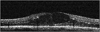 Figure 1A. After multiple focal macular laser treatments, visual acuity stabilized, but significant edema remained and increased macular lipid was present.