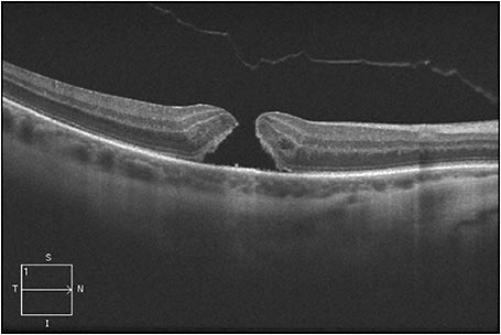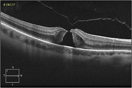 Figure 1. An eye from the series at the New England Eye Center, with FTMH measuring 216 µm and concurrent focal VMT; this patient’s best-corrected Snellen visual acuity was 20/70.