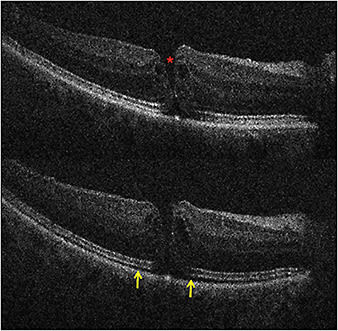 Figure 2. Top) Preincision iOCT B-scan revealing full-thickness macular hole (red asterisk). Bottom) Postpeel iOCT B-scan revealing expansion of the subretinal hyporeflectivity band between the photoreceptor layers and the retinal pigment epithelium (yellow arrows).
