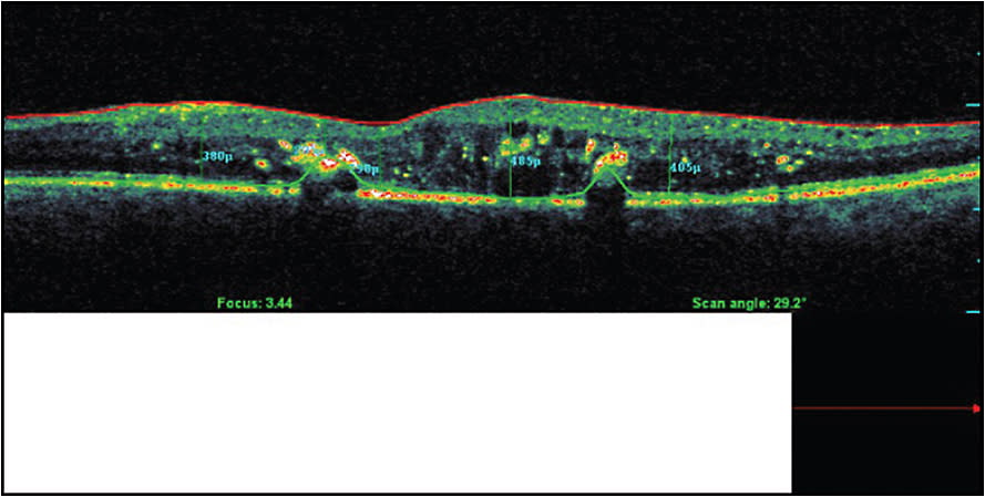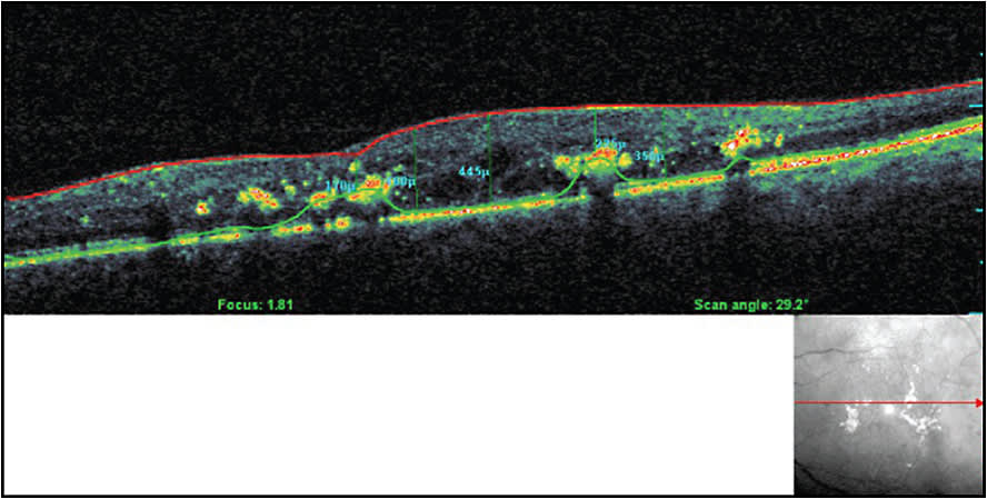 Figure 15. Same patient as in Figure 14. OCT shows suboptimal response after four injections of anti-VEGF and no improvement in BCVA.