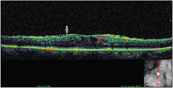 Figure 5. DME presenting with cysts (red arrow) and vitreomacular abnormality (white arrow), which might not be involved in DME pathology.