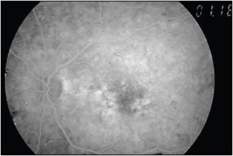 Ischemic diabetic maculopathy usually presents as featureless retina (Figure 1), with markedly reduced best-corrected visual acuity. It can be diagnosed using fluorescein angiography (Figure 2), on which it presents as an enlarged foveal avascular zone (FAZ) or an irregular border of the FAZ due to microvascular enlargement and blockage accompanied by capillary loss. It is important to remember that ischemic diabetic maculopathy cannot be treated, and it has a poor prognosis.