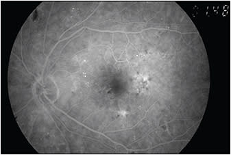 Figure 9. FA of the same patient in Figure 8 showing leakage involving the FAZ.