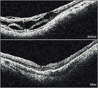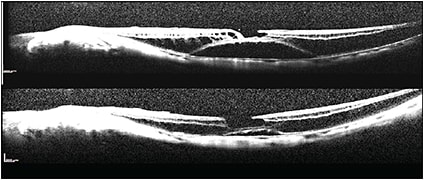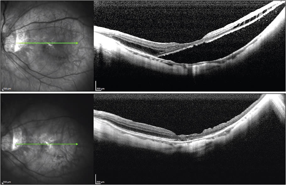Figure 5. Pre- and postoperative OCT images of chronic macular schisis, tractional retinal detachment, and a lamellar macular break. The postoperative view is four months after the surgical intervention. Visual acuities were 20/60 preoperatively and 20/50 at four months. More settling of the detachment may still occur.