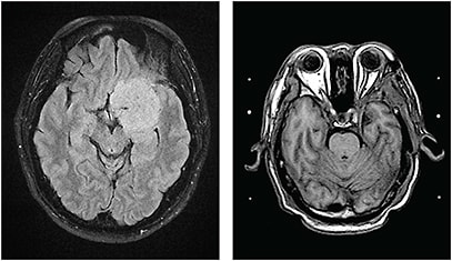 Visual field examination showed a near full field OD, but a severely compromised field was noted OS (Figure 3, next page). Compressive optic neuropathy was suspected. Brain MRI revealed a left skull base meningioma 4.7 x 4.2 cm in size (Figure 4, left).