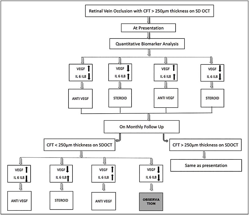 With this knowledge, we propose our approach of customization of intravitreal therapy, depending on the aqueous levels of primary cytokines (VEGF, IL-6, IL-8) in ME secondary to RVO. We call it a “three-step bespoke approach.”