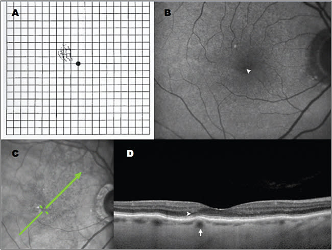 Figure 2. Multimodal imaging of focal choroidal elevations in AMD. A) Amsler grid demonstrating metamorphopsia drawn by this 86-year-old female patient; B) Right eye fundus autofluorescence with no evidence of geographic atrophy but a faint pinpoint area of relative hypoautofluorescence (arrowhead) corresponding to focal choroidal elevation. C) Scanning laser ophthalmoscopic image with green arrow showing raster position for SD-OCT. D) Focal choroidal elevation (arrow) corresponds to the location of metamorphopsia; there is subtle disruption of the ellipsoid zone overlying this region (arrowhead). Images obtained with Heidelberg OCT (Franklin, MA).