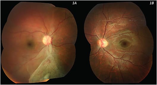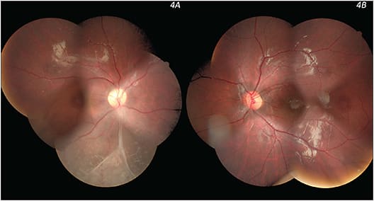 Figure 4. A) The shrinkage of retinal neovascularization was observed during 22-month follow up. B) No significant finding was noted in the left eye.