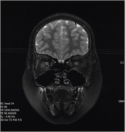 Gadolinium-enhanced MRI demonstrated increased T2W signal intensity in the nerve sheath of the right optic nerve (Figure 3, page 56), without a space-occupying mass or demyelination in the brain parenchyma. A pediatric neurologist was consulted, and optic neuritis in the right eye was diagnosed.