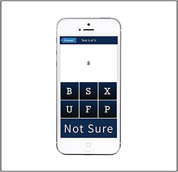Using a simple app called Paxos Checkup (Figure), patients can take a VA test — or one of a number of other vision tests — at home on their smartphone or tablet. They can test weekly, daily, or as frequently as I decide is appropriate, and the results are automatically sent to me.