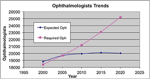First, let’s look at projections for population and provider volumes in the near future because these are critical to know. Although your area’s particular needs might vary, the US data are very clear: there won’t be a sufficient number of eyecare providers as the population grows. The Department of Health and Human Services (HHS) has forecasted a need for 28% more ophthalmologists by 2020; Figures 1 and 2 clearly demonstrate the trend lines.