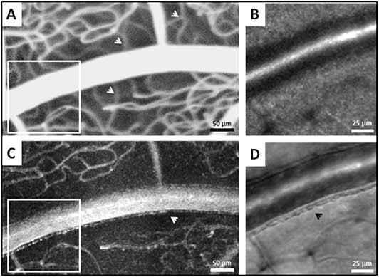 Figure 7. Comparison of AOSLO FA and nonconfocal AOSLO (offset pinhole) at the same location. Nonconfocal perfusion map at this focus shows only superficial capillaries (C) whereas the AOSLO FA perfusion map shows all capillary layers simultaneously (A). Differences in capillary visibility are demarcated with white arrows. Magnified regions indicated by the white boxes in A and C are displayed in B and D. Nonconfocal structural image (D) displays fine vessel wall detail, demarcated with a black arrow, that is not visible on the confocal AOSLO image (B).10