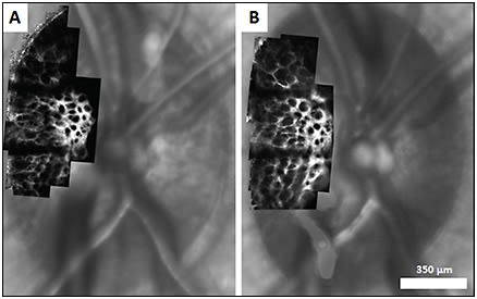 Figure 13. Confocal AOSLO images of lamina cribrosa overlaid on corresponding SLO images in healthy rhesus monkey at baseline (A) and following induction of experimental glaucoma (B). Changes in LC pore geometry are visible between the two imaging sessions.27