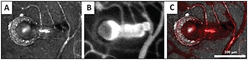 Figure 8. Confocal AOSLO image (A) and AOSLO FA image (B) of a microaneurysm in a patient with hypertension. Superimposing these images ([C], with [B] in red) shows the relationship between the perfused and nonperfused region.11
