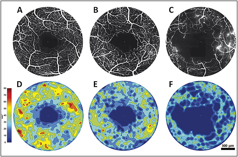 Figure 9. AOSLO FA foveal perfusion maps (top row) and corresponding colorized density contour maps (bottom row) of healthy control eye (A&D), CRVO fellow eye (B&E) and CRVO affected eye (C&F). While the perfusion density is expectantly low in the affected eye, the CRVO fellow eye also exhibits diminished perfusion density compared to the control.14