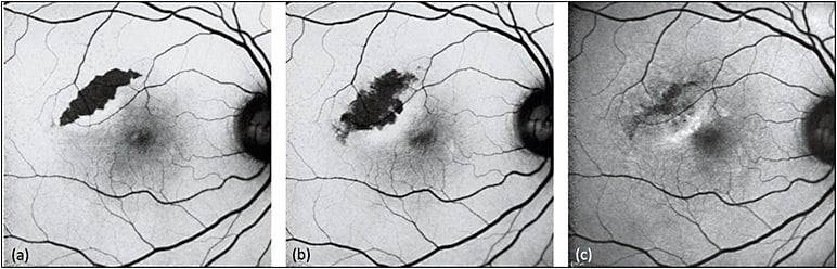 Figure 1. Sequential FAF of RPE tear. RPE tears (a) appear as well-demarcated central hypoautofluorescence due to absent RPE with adjacent irregular hyperautofluorescence corresponding to the retracted edges of RPE. Serial images obtained three weeks (b) and one year (c) later show resurfacing and remodeling of the lesion, with centripetal recovery of autofluorescence extending from the borders.