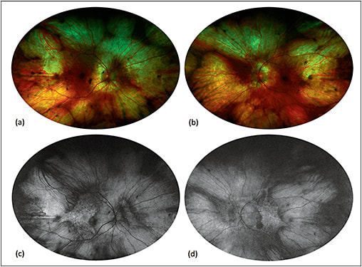 Figure 6. Fundus autofluorescence of choroideremia. Fundus photography (a, b) shows a pale fundus with zones of choroidal atrophy in the midperiphery, revealing the sclera underneath. Fundus autofluorescence (c, d) demonstrates corresponding zones of hyperautofluorescence given the autofluorescent properties of the sclera. Note the central stellate island of preserved choriocapillaris and retinal pigment epithelium in each eye, which is very characteristic of choroideremia.
