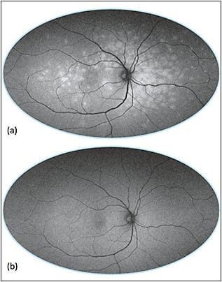 Figure 8. Ultra-widefield imaging of multiple evanescent white dot syndrome (MEWDS). Ultra-widefield FAF of active disease (a) with multifocal hyperautofluorescence and resolution (b) six weeks later.