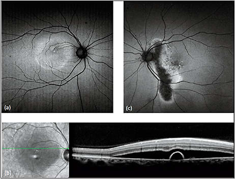 Figure 3. FAF in central serous chorioretinopathy. FAF (a) of a patient with acute exacerbation of CSC shows macular detachment, with hyperautofluorescent material at the margin and inferior region of the detachment. SD-OCT (b) of the lesion shows a serous retinal detachment associated with a small pigment epithelial detachment. FAF of the patient’s asymptomatic father (c) incidentally revealed an atrophic hypoautofluorescent gravitational tract from chronic inactive CSC with hyperautofluorescent margins.
