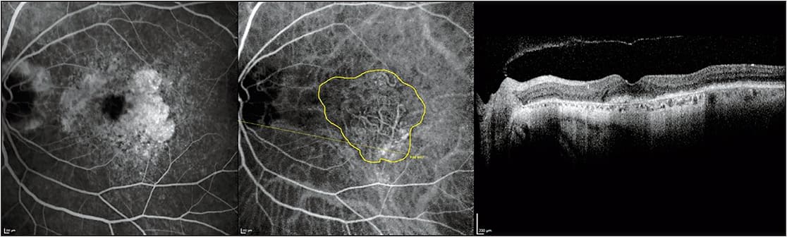 Figure 1. Fluorescein angiography (left), indocyanine green angiography (middle), and optical coherence tomography (right) of a 77-year-old woman with neovascular age-related macular degeneration undergoing bevacizumab therapy using a treat-and-extend protocol. The patient was imaged during the follow-up examination following a successful treatment extension to an eight-week interval. Her Snellen visual acuity was 20/30. Notice the absence of retinal fluid on optical coherence tomography. The choroidal neovascularization is encircled in yellow on indocyanine green angiography and measures 5.79 mm2. Prominent geographic atrophy is evident by fluorescein angiography and optical coherence tomography, but the choroidal neovascularization is indistinct on these systems. The patient was treated with bevacizumab during this follow-up and extended out to a 10-week interval.