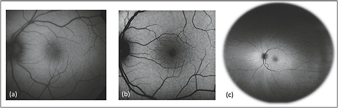Figure 3. Comparison of common imaging systems available for fundus autofluorescence. Images of normal, healthy retina were obtained using the fundus camera with a Spaide filter (a), confocal cSLO (b), and Optos ultrawidefield systems (c).