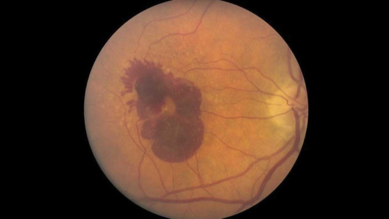 Fundus photograph of a right eye with new submacular hemorrhage from neovascular macular degeneration.