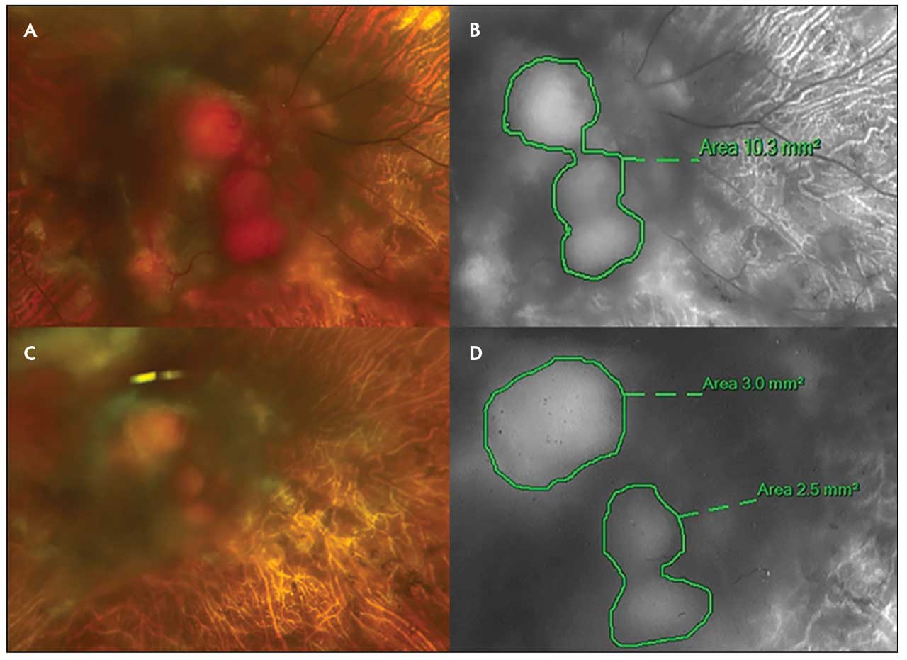 Early evidence suggests a beneficial effect of belzutifan for RCH.21-30 In the phase 2 clinical trial (NCT03401788), patients with RCC received belzutifan dosed at 120 mg per day. Color fundus photography was obtained in 16 patients (29 eyes) with at least 1 RCH. After a median follow-up of 69 weeks, 16 of 29 eyes (55%) were improved, 12 of 29 eyes (41%) were stable, and 1 of 29 eyes (3%) could not be evaluated due to image quality. No progression or new RCH developed on study.31,32 In another case series of 3 patients with RCH, belzutifan resulted in size reduction allowing for consolidation with laser photocoagulation in 2 patients. The third patient had no light perception vision and a large RCH occupying an area of 10.3 mm2. After 7 months, the tumor area decreased to 5.5 mm2 (Figure 2).33 Similar favorable response has been reported in additional cases.34-36