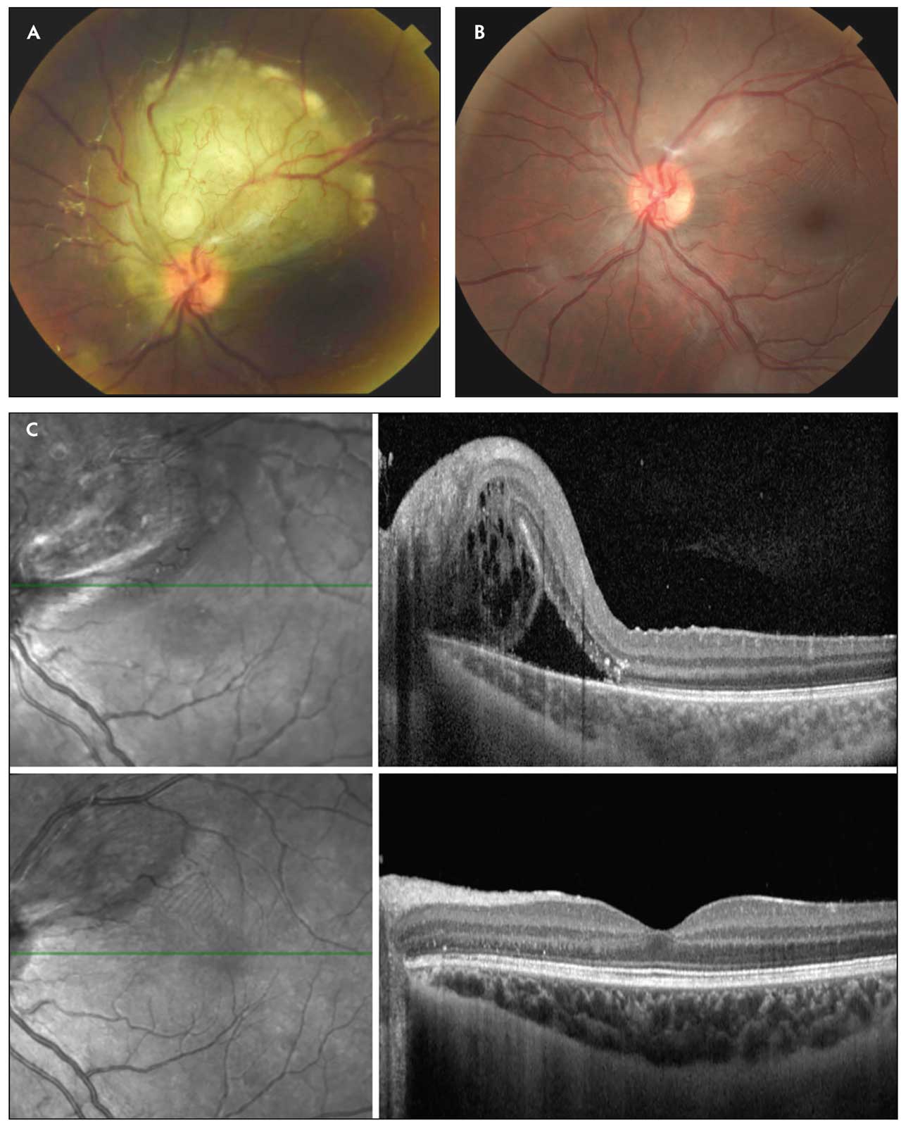 Figure 1. A 16-year-old female with tuberous sclerosis complex presented with an aggressive, rapidly growing retinal astrocytic hamartoma despite 6 intravitreal anti-VEGF treatments administered monthly (A). Sirolimus (2 mg/day) was initiated. At 20 months follow-up, near complete regression of the tumor was observed (B). The initial exudation present on optical coherence tomography (C, top panel) completely resolved with mTOR therapy (C, lower panel). The patient’s visual acuity improved from 20/30 at baseline to 20/20 with treatment. Image courtesy Mary E. Aronow, MD.