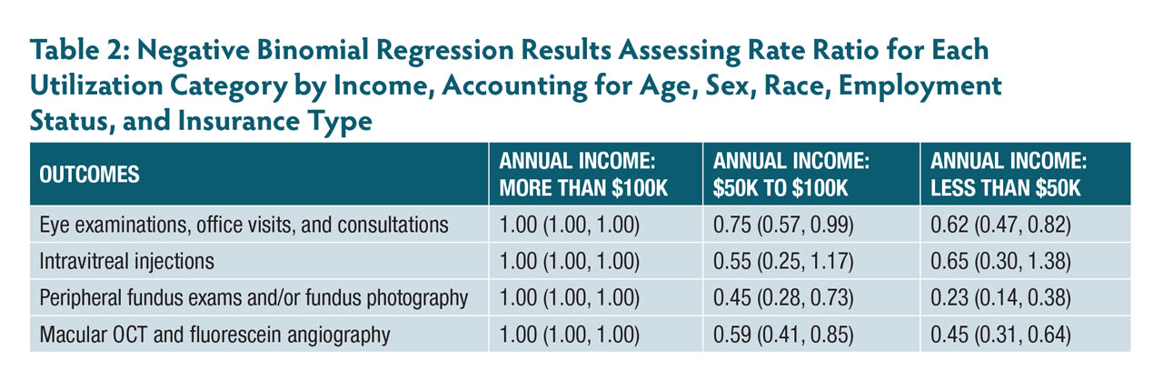 The cohort consisted of individuals aged 65 years or older who had been diagnosed with VT-AMD, as identified by ICD-9 or ICD-10 codes. Outcomes of interest included utilization metrics such as eye examinations, intravitreal injections, and diagnostic imaging procedures like optical coherence tomography (OCT). The frequency of utilization metrics was calculated per 100 person-years. Negative binomial regression models were used to assess the relationship between income levels and eyecare utilization, with adjustments for demographic and clinical variables.