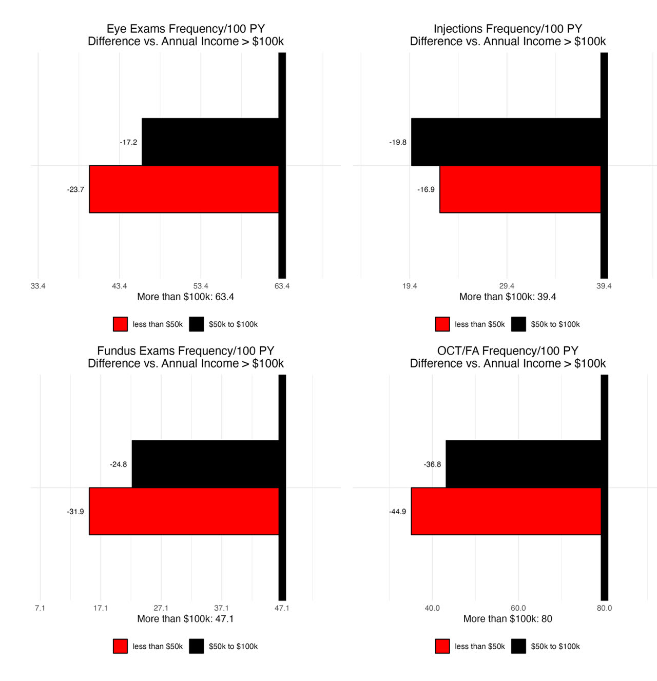 Participants earning $50,000 to $100,000 annually exhibited 25% lower rates of eye examinations, 55% lower rates of peripheral fundus exams and fundus photography, and 41% lower rates of macular OCT and fluorescein angiography compared to those earning more than $100,000 annually. The disparities were even more pronounced for participants with an annual income below $50,000, who had 38% lower rates of eye examinations, 77% lower rates of fundus photography, and 55% lower rates of macular OCT and fluorescein angiography. Despite these significant disparities, there were no observed differences in intravitreal injection rates across income brackets (Figure 1, Table 2).