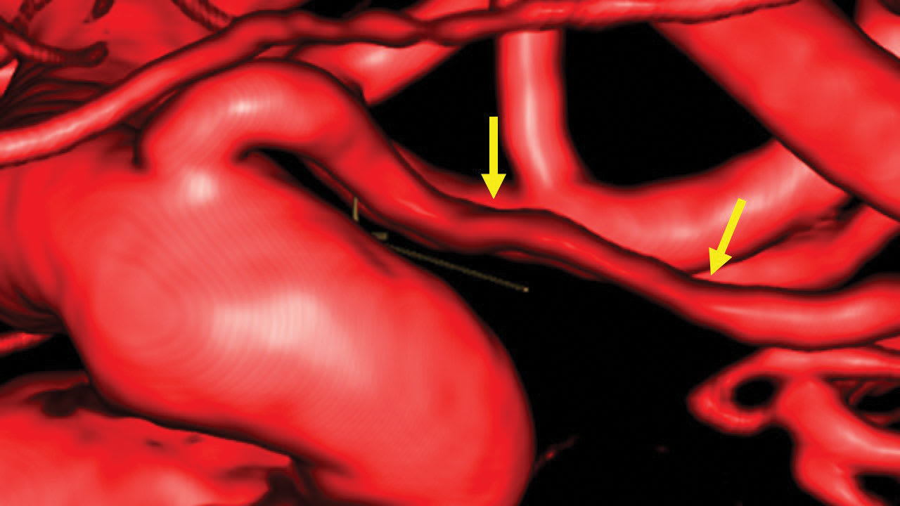 Figure 2. Ophthalmic segment of the left internal carotid artery and ophthalmic artery demonstrating defuse stenosis in the long limb of the ophthalmic artery (between yellow arrows). Three-dimensional rotational angiography image taken with Philips Azurion biplane. Image courtesy OcuDyne.