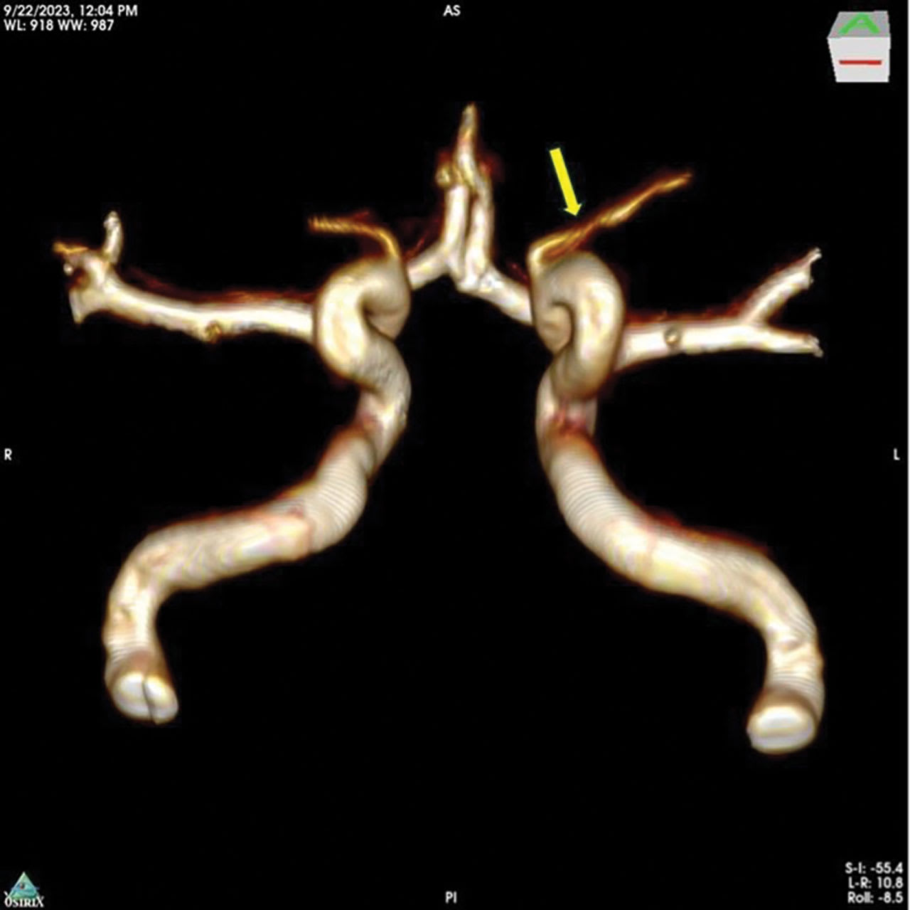 Figure 1. Magnetic resonance imaging angiography shows bilateral internal carotid arteries with ophthalmic artery segments demonstrating defuse stenosis in the long limb of the left ophthalmic artery (yellow arrow). Imaging performed with an Ingenia 3.0T magnetic resonance device (Philips NV). Image courtesy OcuDyne.