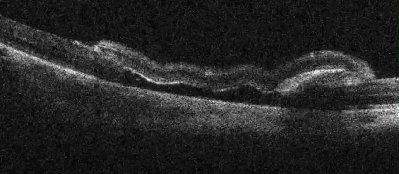 Figure 2. Still image from an iOCT scan showing the placement of an autologous retinal transplant over a large macular hole that was previously repaired but reoccurred several years postoperatively. Image courtesy Sidney A. Schechet, MD.
