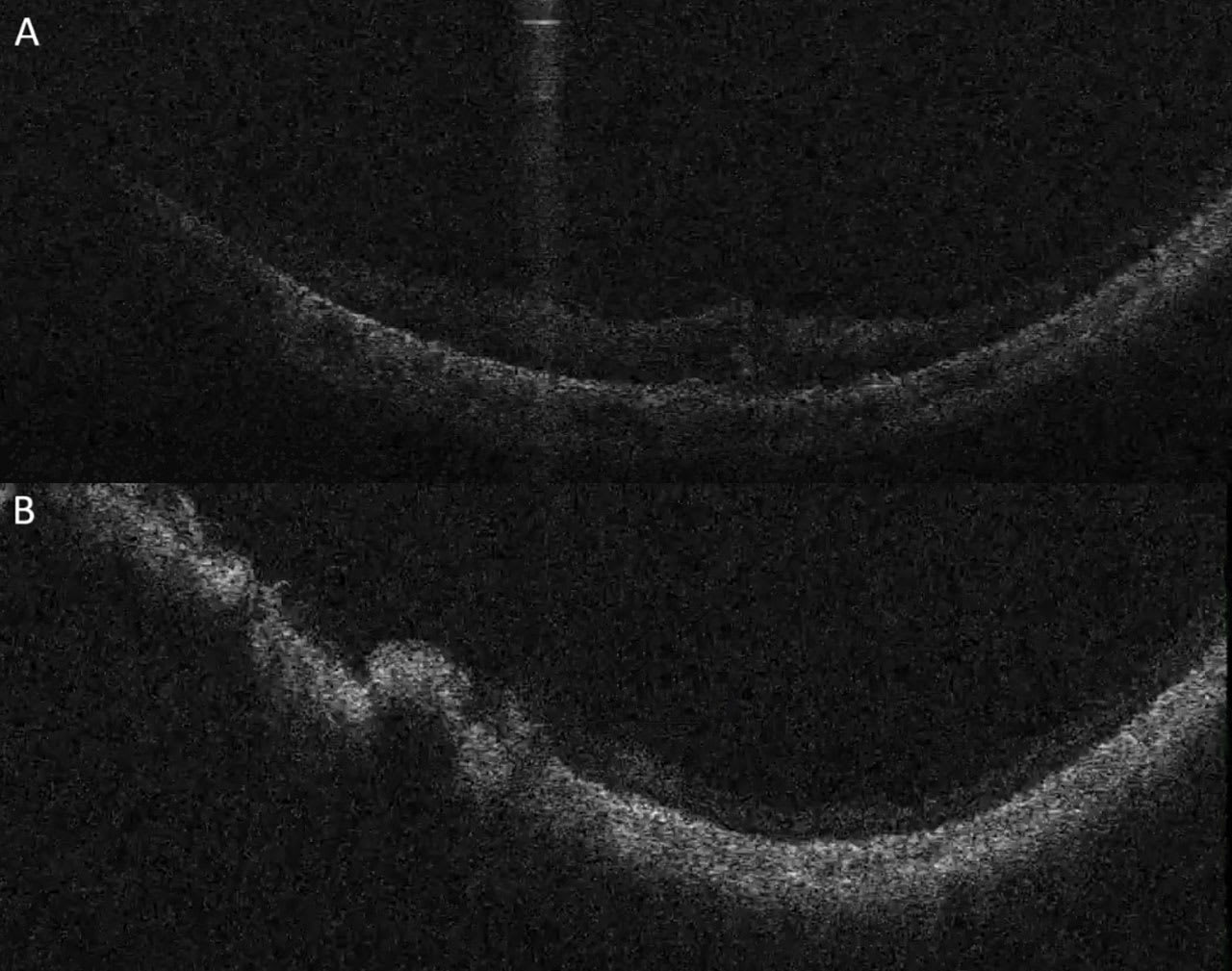 Additionally, iOCT is becoming more widely used in glaucoma surgery in the context of both traditional filtering surgeries and minimally invasive glaucoma surgery (MIGS) procedures.17 iOCT’s ability to improve anterior-segment visualization and facilitate precise surgical maneuvers in challenging anatomic areas like the angle, subconjunctival space, and suprachoroidal space has led to various applications of iOCT in trabeculectomy, stent or drainage device implants, bleb management, and canaloplasty.18