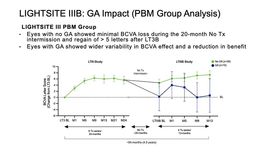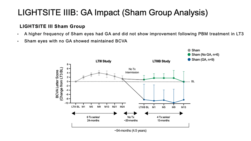 Baseline disease severity, particularly the presence of geographic atrophy (GA), had a significant impact on treatment outcomes (Figure 2). At the start of LIGHTSITE IIIB, 26.3% of PBM-treated eyes and 60% of sham-treated eyes had GA.