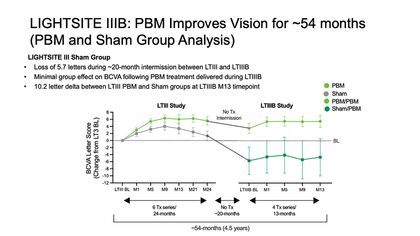 Analysis of the 2 studies suggests that PBM-treated eyes experienced sustained benefit over approximately 54 months, with a cumulative gain of more than 5 letters. By month 13 of LIGHTSITE IIIB, there was a 9.9-letter BCVA gap between eyes originally treated with PBM and those originally assigned to sham.