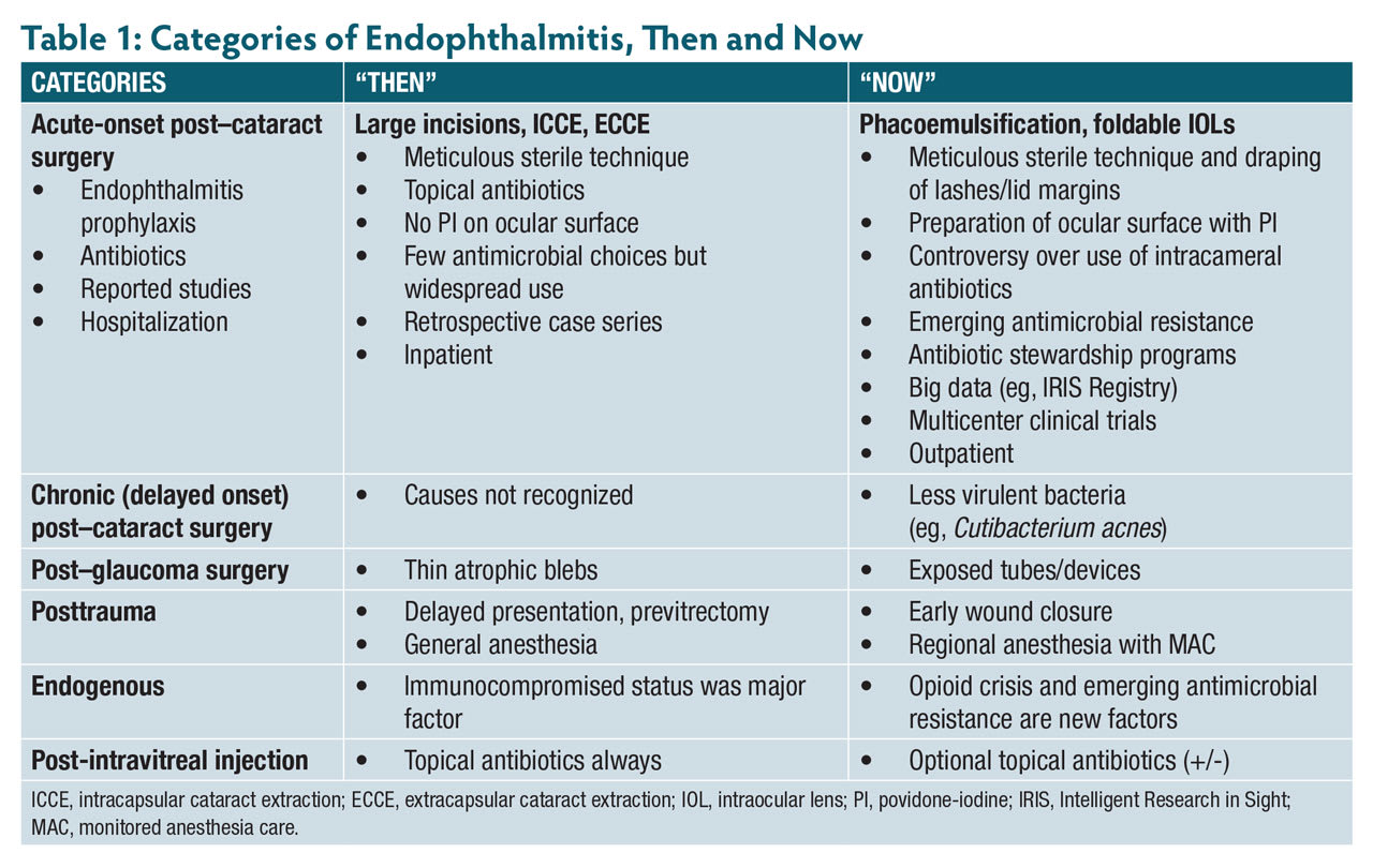 Endophthalmitis can be categorized based on the etiology of infection: acute-onset or delayed-onset postoperative, conjunctival filtering bleb/tube–associated, posttraumatic, endogenous, intravitreal injection–associated, and keratitis-associated. The prophylaxis, diagnosis, and treatment of endophthalmitis has evolved over the decades.