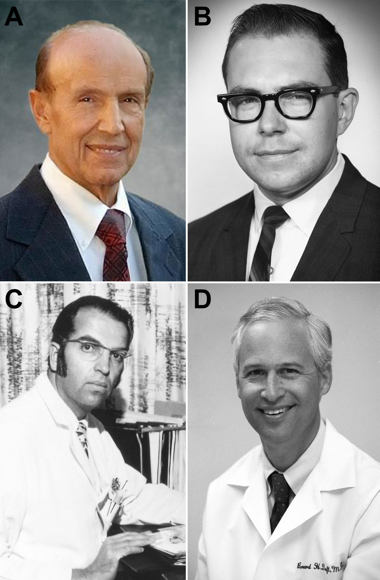 Figure 2. Key historical figures in endophthalmitis diagnosis and treatment. (A) Gholam Peyman, MD, developed techniques for intravitreal antimicrobial therapy; (B) Richard Forster, MD, studied clinical outcomes of intravitreal antimicrobial therapy; (C) Robert Machemer, MD, revolutionized endophthalmitis treatment by developing pars plana vitrectomy; (D) Bernard Doft, MD, was the principal investigator in the Endophthalmitis Vitrectomy Study. Images courtesy Harry W. Flynn Jr., MD.