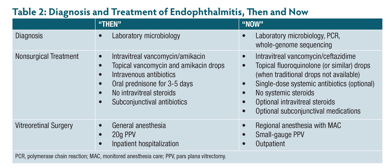 The incidence and management of endophthalmitis have evolved over time. Rates of endophthalmitis have decreased with the implementation of improved surgical techniques, antiseptic practices, and prophylactic antibiotics. The treatment of endophthalmitis (Table 1 and Table 2) has changed from using systemic intravenous antibiotics with prolonged inpatient stays to intravitreal antibiotics with or without oral antibiotics in the outpatient setting.54 Although intravitreal vancomycin remains a component of current first line-treatment, intravitreal amikacin has been replaced with ceftazidime due to reports of retinal toxicity. Intravitreal steroids, although not used in the EVS, are now occasionally used when a bacterial etiology is suspected. Surgical intervention, when indicated, has advanced from 20-gauge PPV under general anesthesia to small-gauge PPV with or without silicone oil tamponade under regional anesthesia with MAC. Potential future directions in the prevention, diagnosis, and management of endophthalmitis include the use of prophylactic intracameral antibiotics, advanced diagnostic techniques, and small-gauge PPV. By understanding the history and future directions of endophthalmitis, retina specialists will be better equipped to manage this often challenging condition. RP