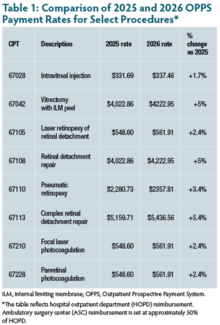 In late November, the Centers for Medicare and Medicaid Services (CMS) released its final 2026 rule for hospital outpatient departments (HOPDs) and ambulatory surgery centers (ASCs), setting a 3.3% overall increase to payment rates under the Outpatient Prospective Payment System (OPPS). The final rule maintains CMS’s use of Ambulatory Payment Classifications (APCs) to reimburse groups of similar procedures, with intraocular procedures grouped into 6 levels (APC 5491 to APC 5496).