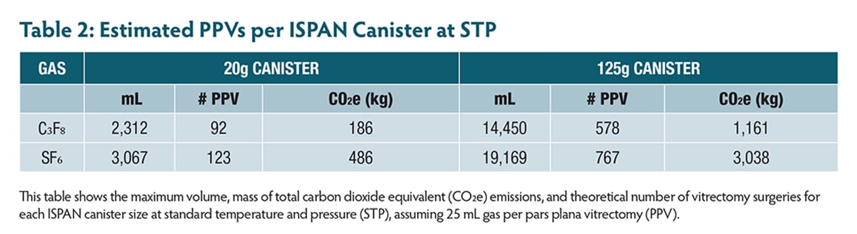 In the UK study, smaller canister volumes were associated with significantly improved efficiency. In the US market, ISPAN gas canisters (Alcon) are currently available in 20 g and 125 g sizes; the previously available 450 g canister is no longer being distributed. Assuming 25 mL are used per PPV surgery, the number of theoretical surgeries that each canister should allow at standard temperature and pressure (STP) are presented in Table 2. Each canister has an expiration date of 2 years, and all gas remaining in canisters after the date of expiration is typically discarded.