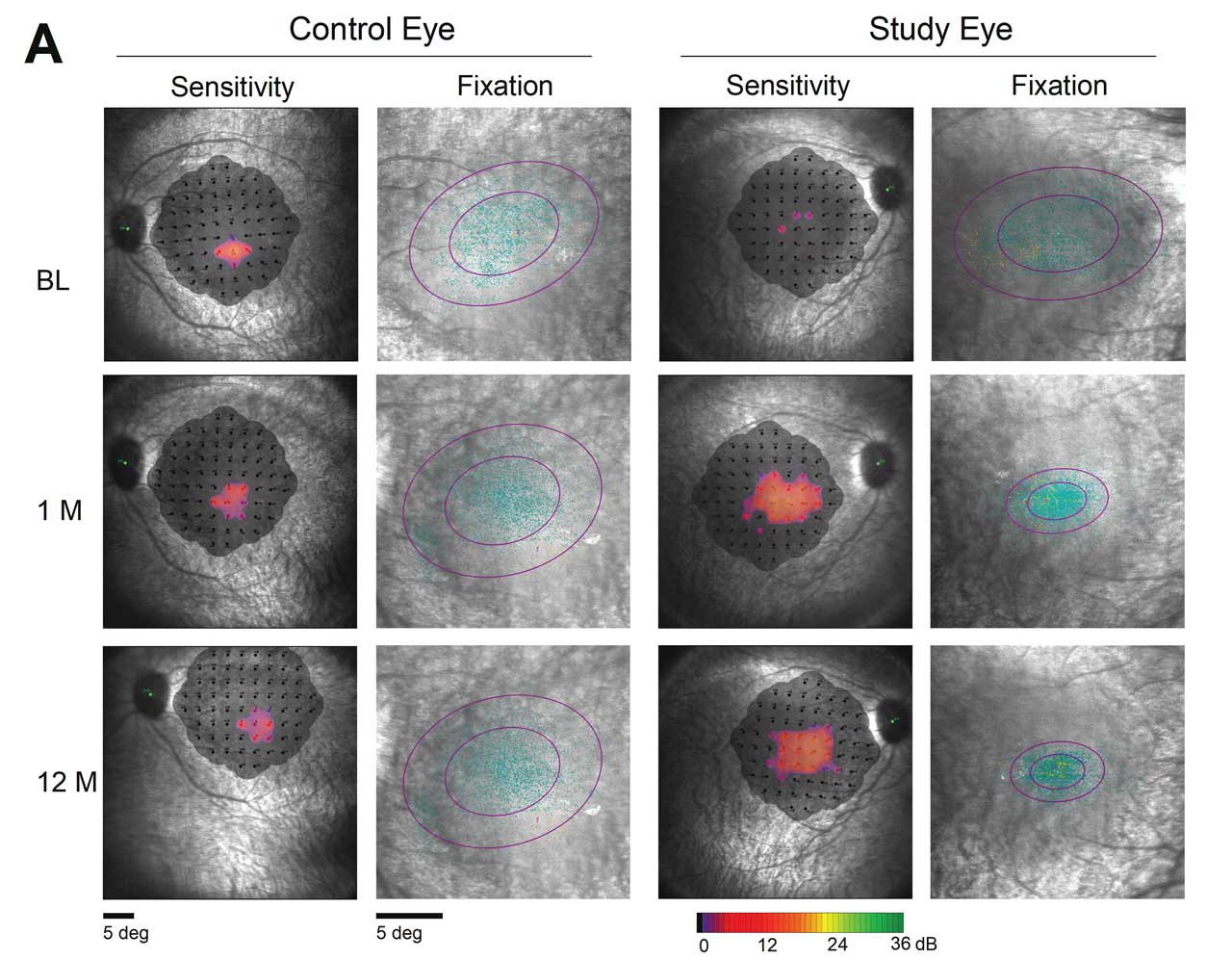 Additionally, full-field stimulus testing demonstrated larger improvements in sensitivity from baseline in treated eyes, with a 0.86 log improvement at 12 months vs 0.16 log units for control eyes. Microperimetry data were collected from 1 patient (not possible in the other 2 participants due to poor fixation). At 12 months, fixation stabilized and shifted toward the foveal center, suggesting improved central vision with improved fixation (Figure 1). OPGx-LCA5 was well tolerated with no reports of dose-limiting toxicities or serious adverse events out to 12 months.