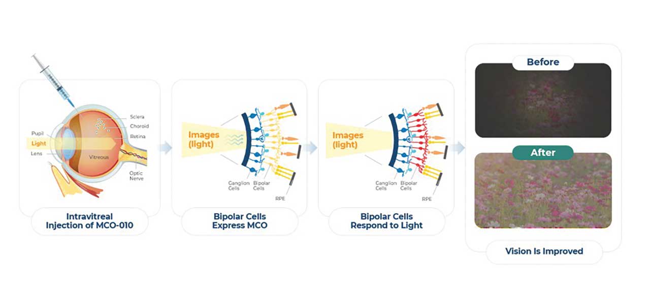 Figure 3. MCO-010 is intravitreally delivered via AAV2 as a multicharacteristic opsin (MCO) transgene to transduce bipolar cells to express a photosensitive opsin protein.