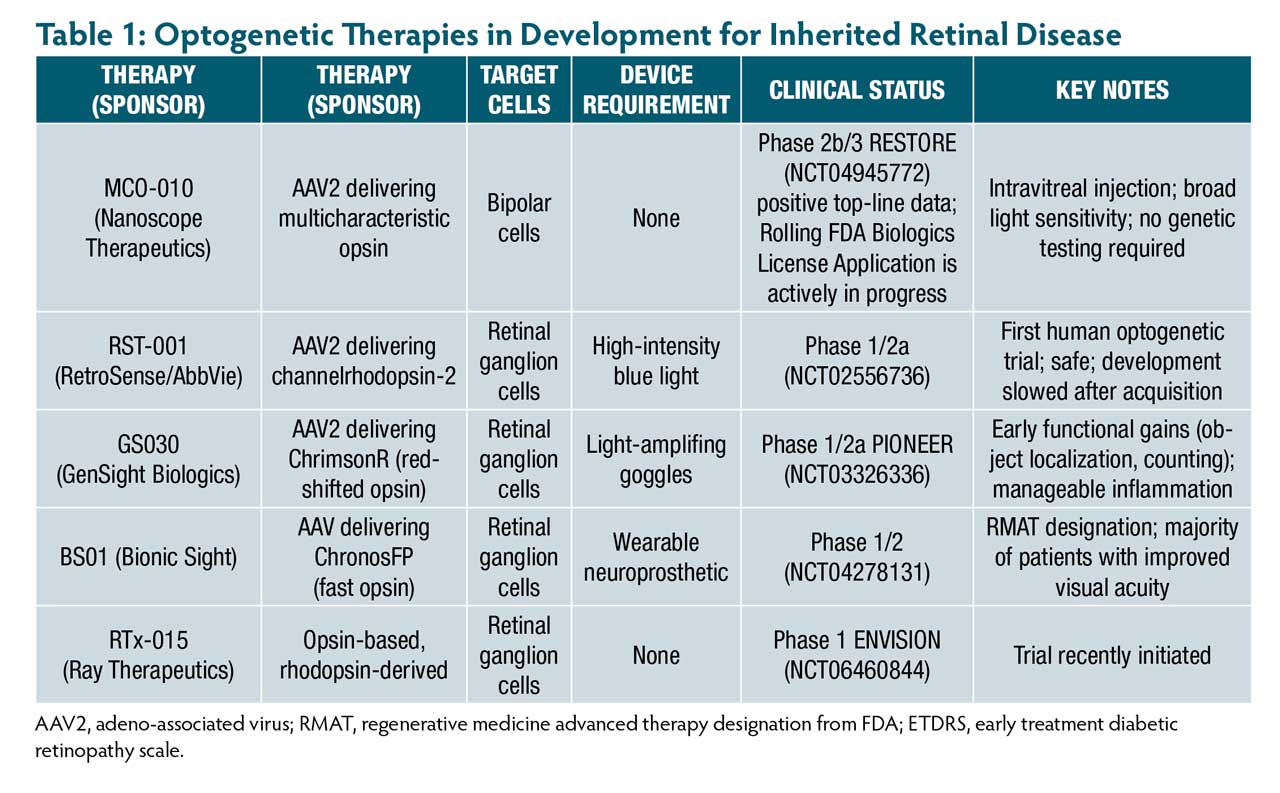 Inherited retinal diseases (IRDs) are a group of conditions responsible for irreversible vision loss in 20% to 25% of working-age individuals globally.1-3 Although retina specialists encounter IRDs with increasing frequency, at this time there is only one FDA-approved therapy across all IRDs. There is hope, however, in a specific type of gene therapy called optogenetics. This mutation- and disease-agnostic approach introduces genes encoding for opsins, or light-sensitive proteins, into the retina to regain light sensitivity and restore a degree of functional vision.4