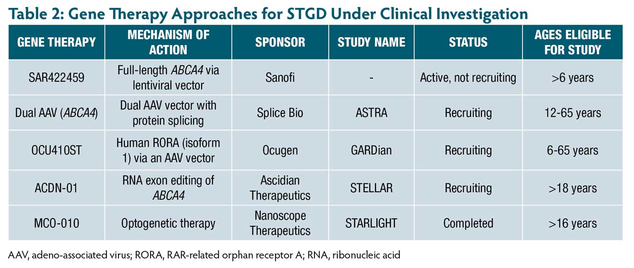 OCU410ST(Ocugen) is a novel modifier gene therapy under investigation for STGD. Instead of replacing ABCA4, OCU410ST delivers human RORA (isoform 1) via an AAV5 vector to regulate retinal homeostasis. Its mechanism targets inflammation, oxidative stress, lipid metabolism, and complement activation.24 In a phase 1 open-label, dose-escalation trial, 9 participants received a single subretinal injection in the worse-seeing eye. OCU410ST was well tolerated. At 6 months, treated eyes showed stable or improved VA, and atrophic lesion growth was 54% slower vs untreated fellow eyes.24 These findings support a phase 2/3 pivotal trial, which has received FDA clearance.25 This gene-agnostic strategy offers a promising alternative to conventional gene replacement.