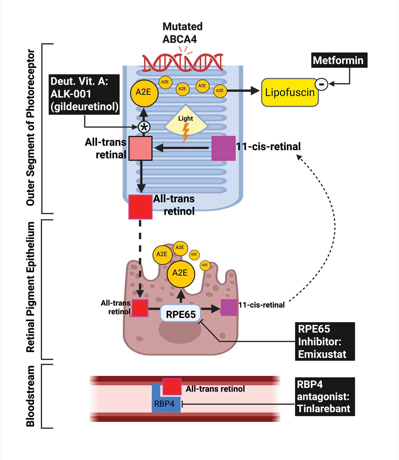 Figure 1. ABCA4 dysfunction in STGD and pharmacologic targets within the visual cycle. In photoreceptor outer segments, the ABCA4 protein facilitates the clearance of all-trans-retinal. Loss-of-function ABCA4 mutations impair this process, resulting in intradiscal accumulation of toxic bisretinoids such as A2E, which are phagocytosed by the retinal pigment epithelium (RPE) and contribute to lipofuscin deposition and RPE toxicity. The visual cycle involves photoisomerization of 11-cis-retinal to all-trans-retinal, followed by reduction to all-trans-retinol, its transfer to the RPE, and reconversion by RPE65 to 11-cis-retinol. Multiple pharmacologic strategies aim to mitigate toxic byproduct formation: ALK-001 (deuterated vitamin A) slows A2E generation; metformin may modulate lipofuscin accumulation; emixustat inhibits RPE65 to reduce chromophore recycling; and tinlarebant (RBP4 antagonist) limits systemic retinol delivery. Together, these interventions target distinct steps in the visual cycle to slow disease progression in STGD.