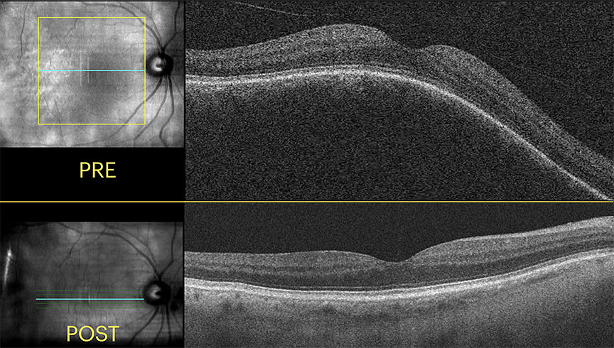 Figure 3. Optical coherence tomography images showing the curvature of the macula in the patient’s first visit in the top panel. Note that the choroid is very thick, almost unmeasurable, and there is a convex-appearing macular surface. Following radiation treatment, the choroidal anatomy appears more appropriate, and the curvature of the macula returns to its normal concave shape.