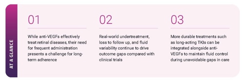 Long‑acting tyrosine kinase inhibitors (TKIs) offer sustained delivery and a novel mechanism that may provide a practical path to reduce variability between visits while maintaining outcomes.