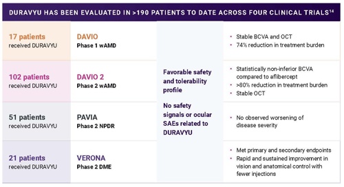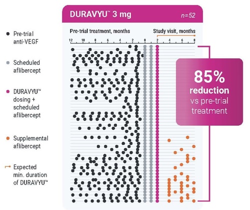 In DAVIO 2, DURAVYU 3 mg reduced treatment burden by 85% compared to the prior 6 months (annualized mean of 10 anti-VEGF injections before the trial for both arms)20